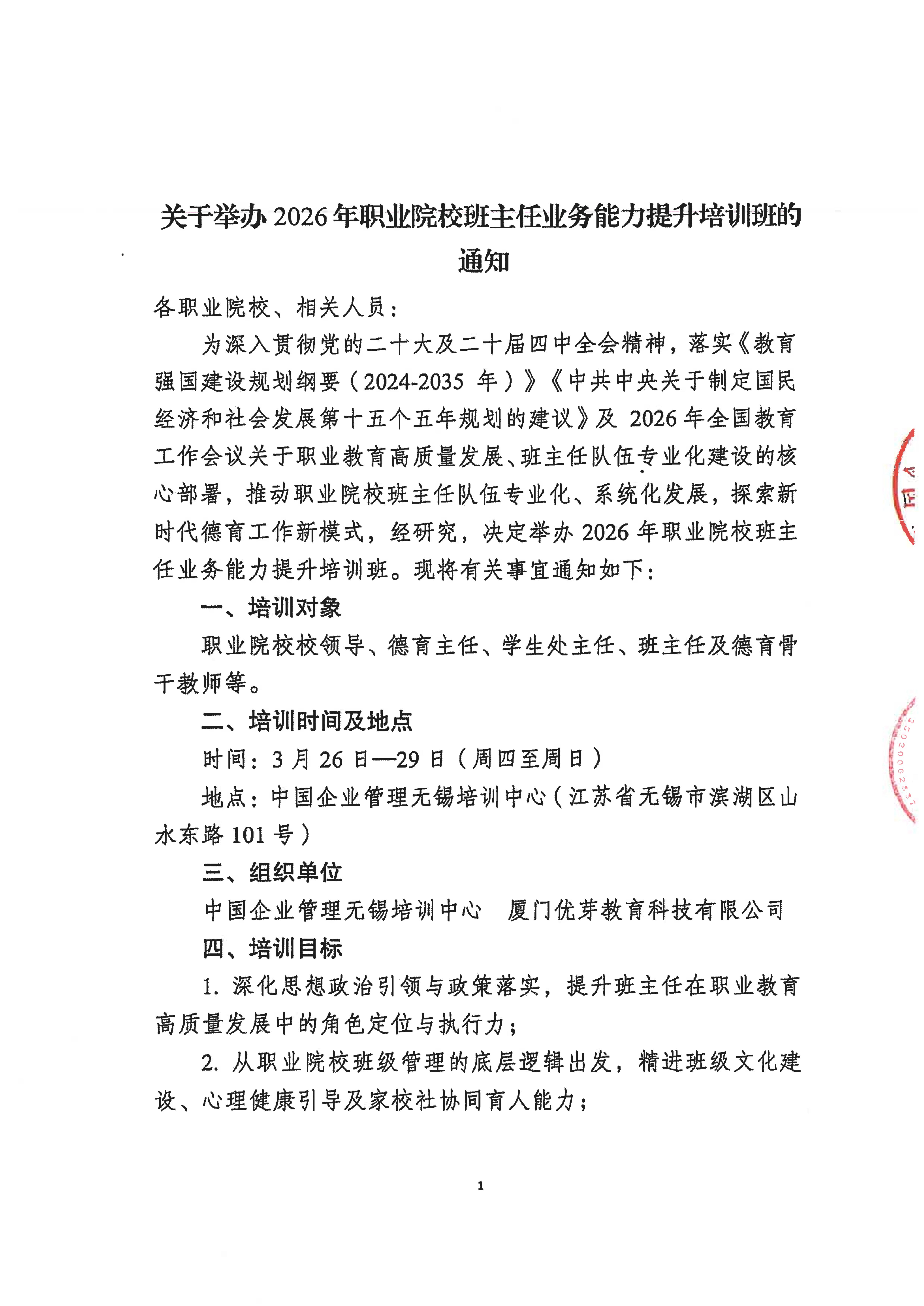 2026年3月26日-29日,由中国企业管理无锡培训中心与厦门优芽教育科技有限公司联合组织的2026年职业院校班主任业务能力提升培训班将在江苏无锡开班啦!
