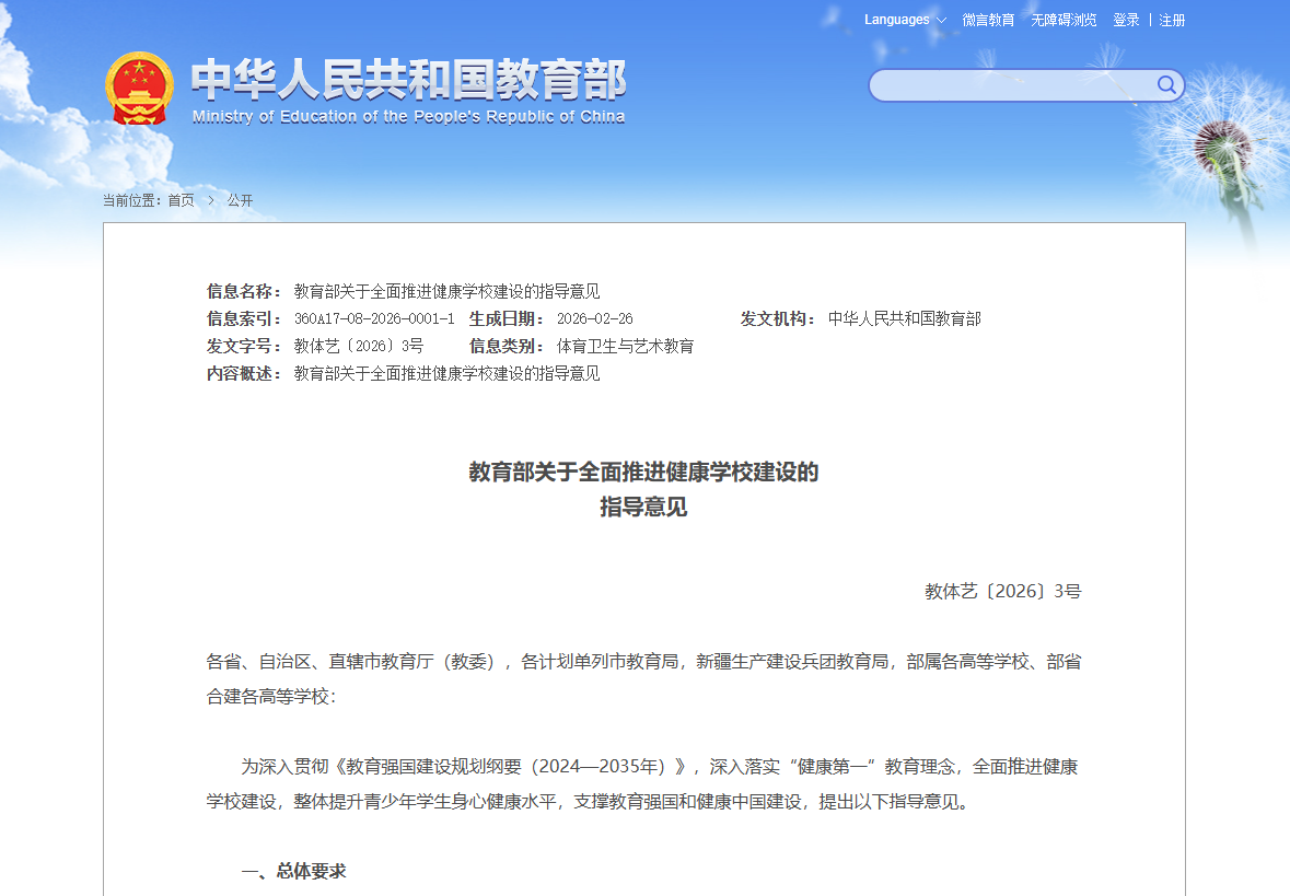 教育部发布关于全面推进健康学校建设的指导意见